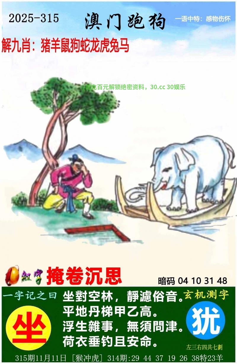 315期:今期生肖一八开,穿金戴银戴兰花。今期特尾二三七,三八三九还要防。风流才子俏佳人,玄机道破点三二。买了一六出二九,森林之中它为王。 |